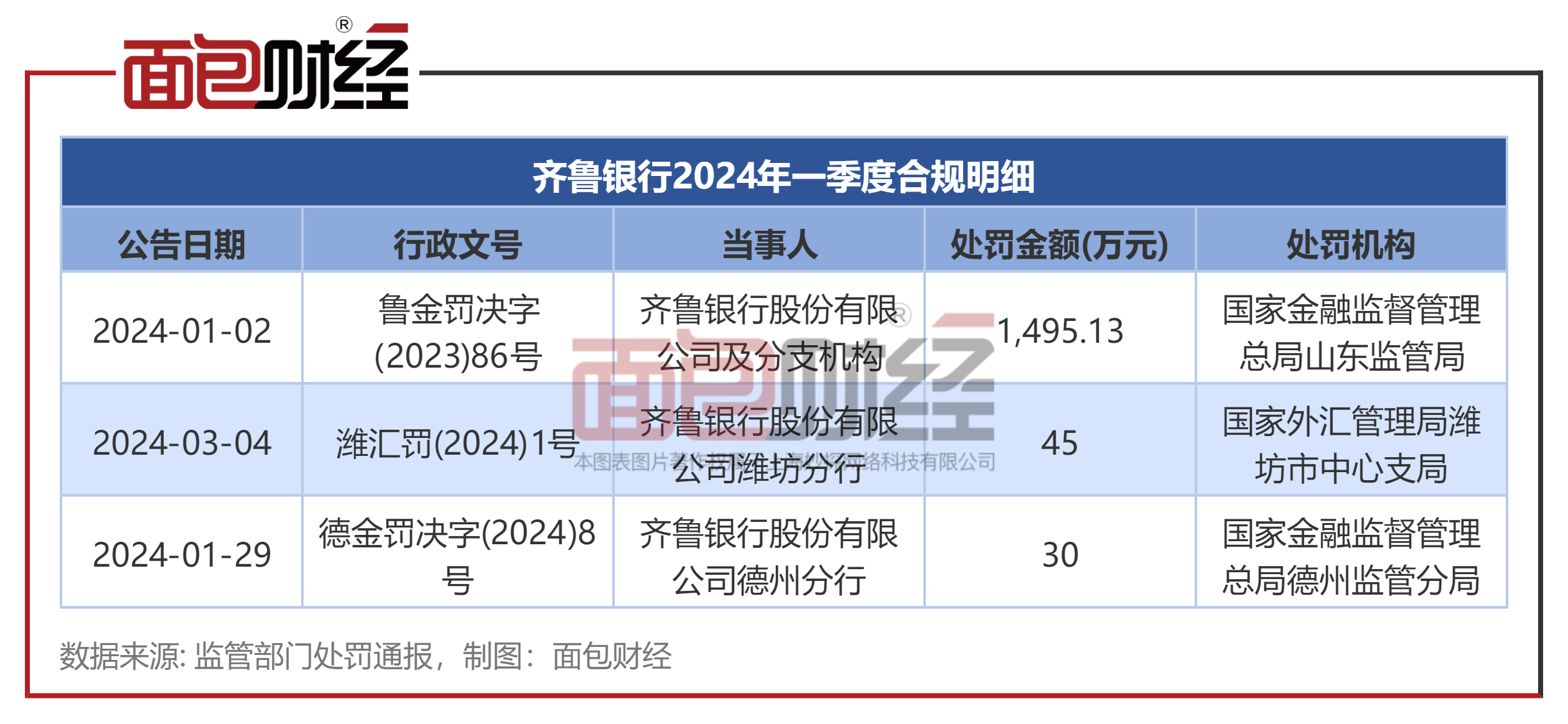 根据监管部门通报信息统计,2024年第一季度,涉及齐鲁银行及其分支机构的罚单有3张,罚没金额合计1570.13万元。