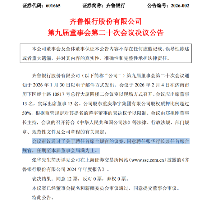 2月4日,齐鲁银行发布第九届董事会第二十次会议决议公告,会议审议通过了关于聘任首席合规官的议案,同意聘任张华行长兼任首席合规官,任期至本届董事会届满为止。
