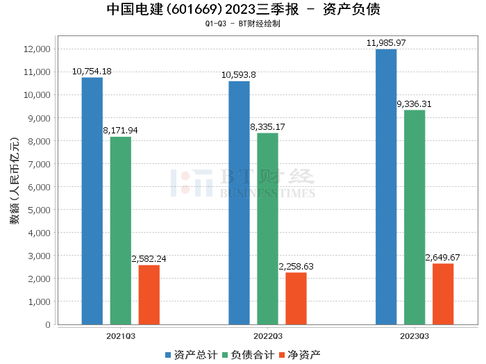 在资产负债方面,根据2023年三季报显示,中国电建的总资产达到了11985.97亿元,相比上年度末的10401.08亿元增长了15.24%。负债合计也有所上升,从上年度末的7997.59亿元增至9336.31亿元。净资产从上年度末的2403.49亿元增长至2649.67亿元。资产负债率略有上升,从76.89%增至77.89%。这些变化反映了公司规模的扩大和财务结构的相应调整。