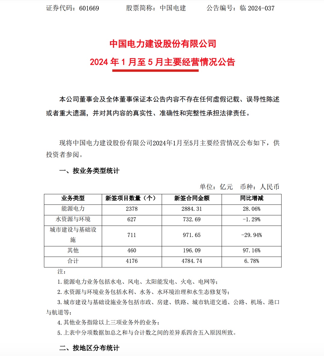 中国电力建设股份有限公司(中国电建,601669.SH)发布了2024年1至5月的主要经营情况公告。
