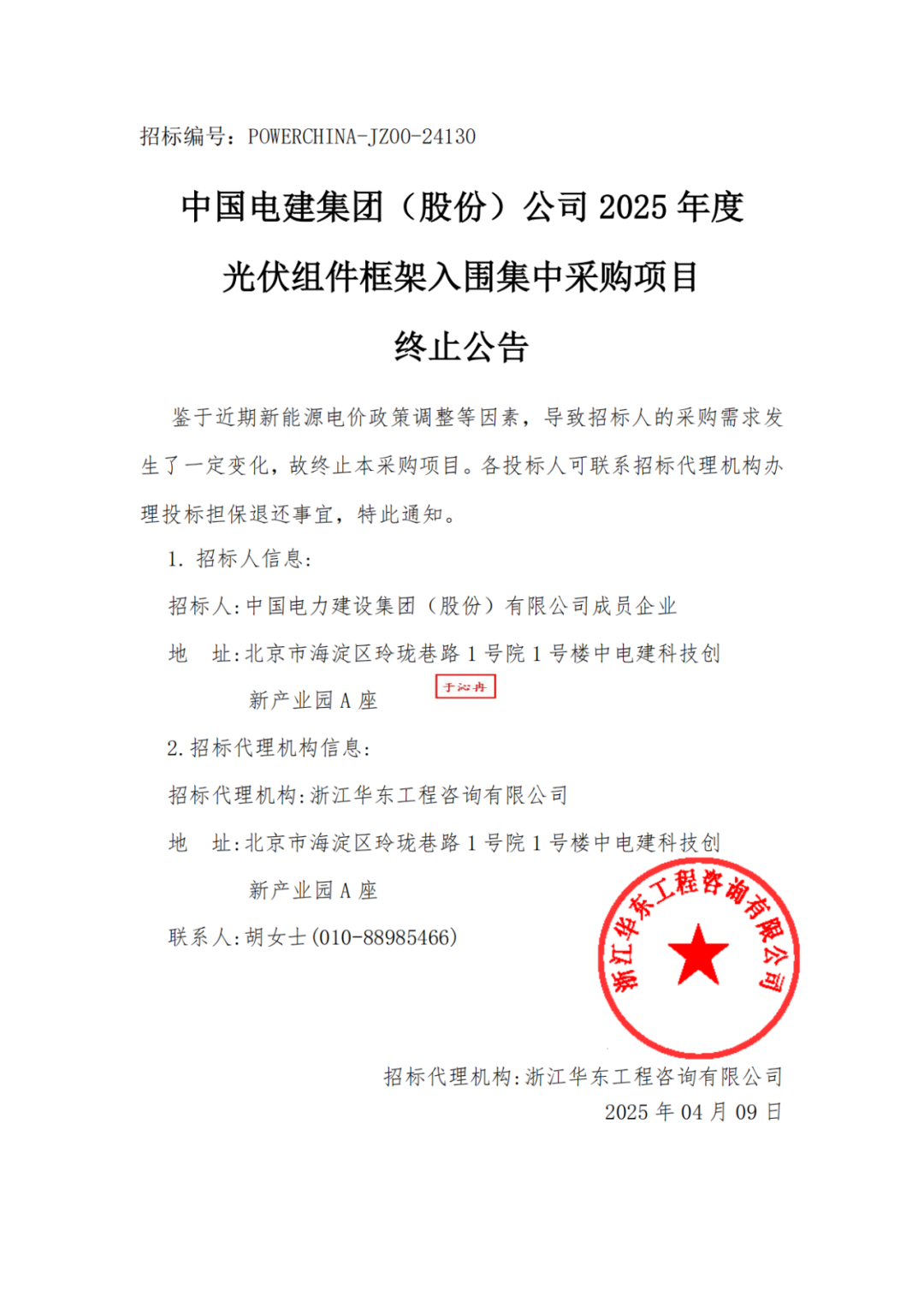 中国电建表示,鉴于近期新能源电价政策调整等因素,导致招标人的采购需求发生了一定变化,故终止本采购项目。