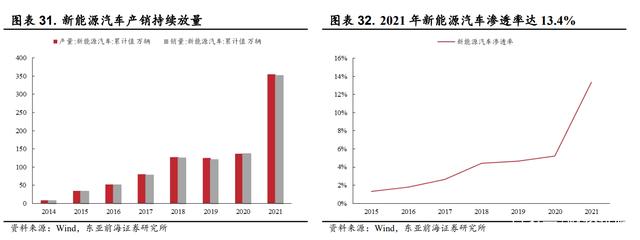 新能源汽车持续放量,2021年渗透率已达 13.4%。在政策带动下,我国新能源汽车产销规模高速增长。2021 年全年我国累计生产新能源汽车354.5 万辆,销售量达 352.1 万辆,分别同比增加 159.5%和 157.5%。从新能源汽车渗透来看,我国新能源汽车占汽车销量的比率逐年提升,2021年达 13.4%