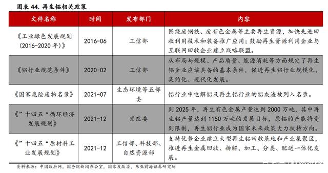 2020年起,铝灰渣被认定为危险废物,需由具备专门处置能力的企业进行处置。2020年至 2021年,工信部、生态环境部、各省市生态环境厅局共发布 6 条铝灰渣相关政策,旨在加强铝灰渣的处置管理工作以及督促相关化工厂的安全生产。在行业政策整体趋严的背景下,再生铝行业或将迎来新一轮的洗牌。