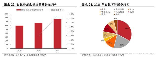 从下游消费结构来看,铝板的下游应用领域中,占比最大的前两大领域分别是建筑行业与交通运输行业。建筑行业对铝板的需求量占 33%,交通运输基础设施等占 21%。随着建筑与交通运输行业需求的持续增长,未来铝板带箔需求量或将持续提升。