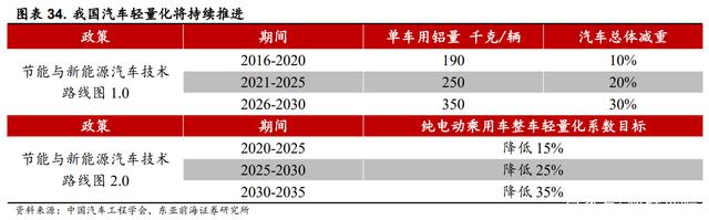 政策推动下电动车用铝量将持续提高。在我国汽车轻量化实施目标上,将单车用铝量列为减重指标。从2016年编制的《节能与新能源汽车技术路线图 1.0》来看,目标期间单车用铝量将持续提升,预计2026年到2030年,单车用铝量达 350 千克/辆,车体总减重 30%。