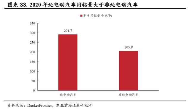 电动汽车自重高于传统燃油车,带动单车用铝量提升。对于纯电动汽车,其额外增加的三电系统使得电动车相比于燃油车大幅增重,从而影响其续航里程,因此实现电动汽车轻量化极为重要。因此,成本适中、性能优异的铝材成为了电动车轻量化的首选材料。从单车用铝量来看,2020 年纯电动汽车的单车用铝量约为 291.7Kg,高于非纯电动汽车的 205.9Kg。