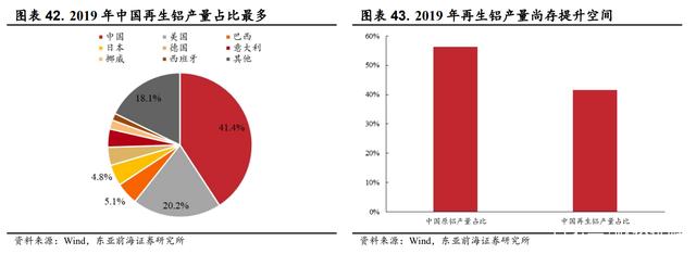 从产量规模来看,2019 年我国再生铝产量占世界总产量的 41.4%,占比最大。但从铝产量结构来看,目前我国仍以电解铝为主,2019 年同期我国原铝的产量在全球占比约为 56.2%,较再生铝产量占比高出 14.8 个 pct。随着未来国内铝金属生产结构的持续优化,预期我国再生铝行业仍具有较大的成长空间。