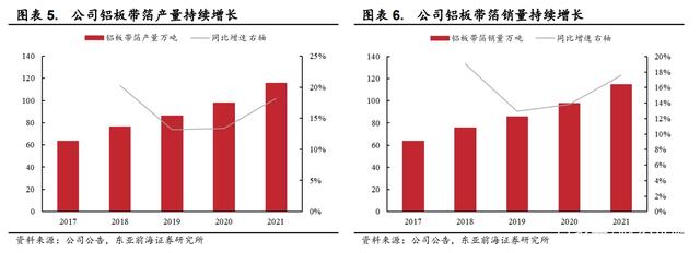 铝板带箔产销量持续增长,创新动力不断涌现。产量方面,2021 年公司铝板带箔产量达到 115.7 万吨,同比增长 18.2%;销量方面,2021 年公司铝板带箔销量为 114.5 万吨,同比增长 17.5%。