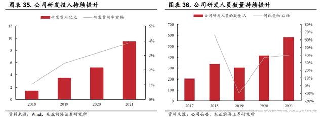 从研发费用的角度来看,近年来公司的研发费用水平持续提升。截至2021年,公司的研发费用已达9.53亿元,同比提升约84.0%;从研发人员的数量来看,公司2021 年的研发人员数量已达580人,较去年提升约40.1%。