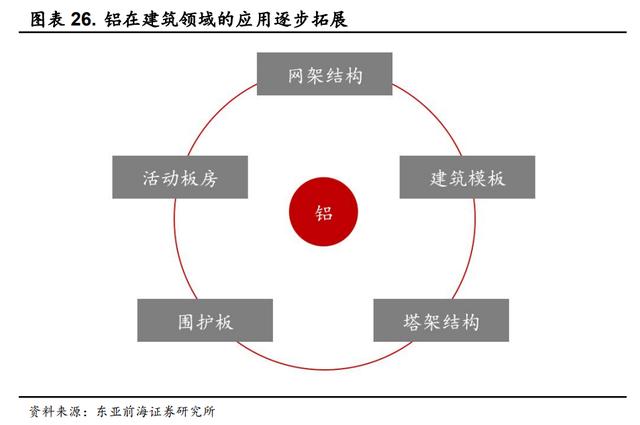 铝材在建筑领域的用途来看,最初铝材在建筑中的使用多为门窗、墙面、屋面等,而随着国内建筑标准的逐步提升,铝材更为轻量化、易于缩短工期的特点逐步被建筑业所发掘,铝材的用途逐步扩展至活动板房、网架结构、建筑模板等多项领域。此外,在我国《有色金属行业“十四五”发展规划》中明确指出将进一步提升我国高强铝合金等材料竞争力。预期未来我国建筑业用铝将进一步扩大。