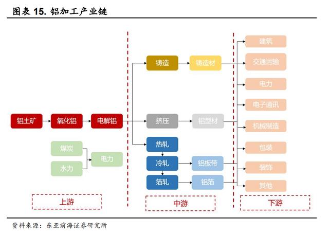 铝材加工处于铝产业链中游环节,下游对口应用领域较为广泛。从产业链来看,铝加工产业链的上游为电解铝和再生铝行业;中游为铝加工产品的生产过程,产品主要为铝板带箔和铝型材;下游为铝加工制品的应用,应用领域较为多样化,包括建筑、交通运输、电力、电子通讯、机械制造等领域。