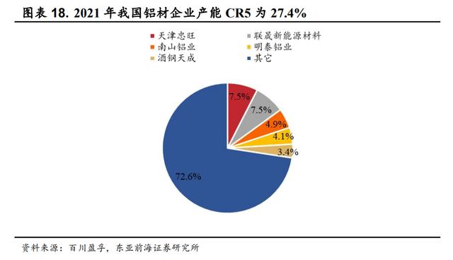 根据百川盈孚数据,国内铝板产能排名前 5 位企业占据全市场总产能的 27.4%,天津忠旺和联晟新能源材料均占全市场产能的 7.51%。随着铝加工行业逐步向高端化、高附加值转型,市占率大的企业较一般企业在产线升级、设备配套等方面更加具有优势,龙头企业市占率或将进一步扩大。