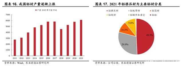 铝材产量逐渐增长,铝板带材产量提升较为明显。铝材产量方面,2021 年我国铝材产量为 6105.2 万吨,同比增长 5.64%,2020 年我国铝材产量为 5779.3 万吨,同比增长 10.04%。铝材产量占比方面,铝材分为铝板带材、铝箔材、铝挤压材、铝线材、铝粉以、铝锻件和其他。其中铝挤压材占 49%,铝板带箔总体占比 40%,产品种类集中度较高。此外,在各类铝材中,铝板带箔产量增幅最大,2021 年我国铝板带产量增幅为 12.70%,铝箔产量增幅为 9.60%,均高于其他产品
