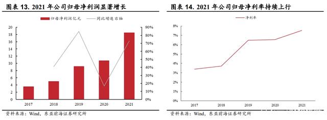 归母净利润总额方面,2021 年公司实现归母净利润 18.52 亿,同比增加 73.1%。2020 年公司归母净利润为 10.70 亿,同比增长 16.7%。净利率方面,2021 年公司净利率为 7.5%,净利率水平近 5 年来持续走高。预期随着公司不断优化产品结构,公司净利率水平仍有望持续增长。(报告来源:远瞻智库)
