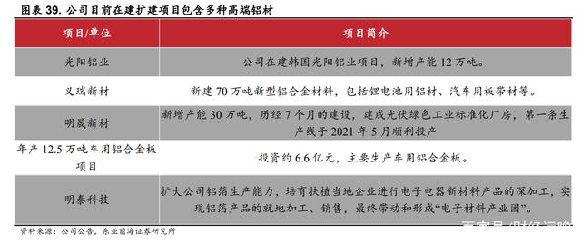 公司目前扩建项目有子公司光阳铝业 12 万吨产能、义瑞新材 70 万吨新型铝合金材料、明晟新材 30 万吨产能、年产 12.5 万吨车用铝合金板项目以及明泰科技的“电子材料产业园”项目。在建扩建项目主要以生产铝板带箔等高端铝材为主,目前国内高端铝材仍多依赖进口,且相关产品利润空间更为广阔,公司相关项目的持续落地或将打开公司盈利空间。