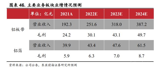 我们假设:(1)公司铝板带箔产品 2022 年价格基本与当前均价持平;(2)后续年度公司铝板带箔价格稳中有升;(3)公司新增铝板带箔产能逐步投放。则公司 2022 年铝板带、铝箔两大主要业务板块的毛利水平将分别为 30.1 亿元、6.3 亿元。