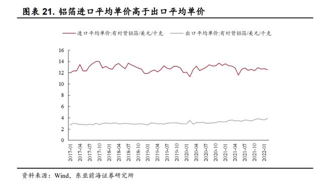 根据 Wind 数据,2017-2021 年期间我国有衬背铝箔进口平均单价为 12.83 美元/千克,远高于出口平均单价 3.12 美元/千克。出口平均单价低于进口平均单价的主要原因是我国铝材出口以中低端产品为主,而进口多为高端产品。该现象说明国内高端铝板带箔等产品仍部分依赖进口。