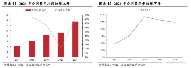 从费用的绝对规模来看, 2021 年公司费用总额为 13.45 亿,同比增长 46.7%。公司费用整体规模的增长主要由规模扩大、研发投入加大所致。