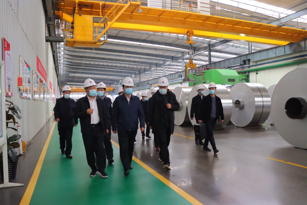 明泰铝业董事长马廷义、总经理刘杰向何省长一行介绍了企业产业、进出口以及循环经济发展情况,并一同走进高精度铝箔生产现场和高架智能仓库。何省长深入了解了企业的发展成果,对企业取得的成绩给予了高度评价。