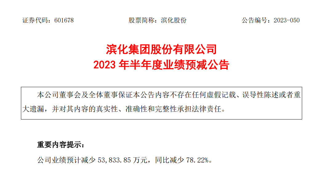 7月10日,滨化股份发布业绩预减公告,2023年上半年度业绩预计减少 53,833.85 万元,同比减少 78.22%,扣非净利润预计减少53,666.70元,同比减少79.48%。