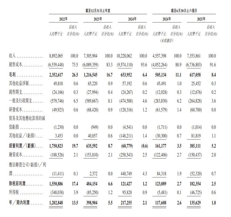 招股书显示,2022年-2024年及2025年1-6月,滨化股份的营业收入分别为人民币88.92亿、73.06亿、102.28亿和73.54亿元,期内利润分别为人民币12.03亿、3.99亿、2.17亿和1.36亿元。由此不难发现,2024年滨化股份营业收入虽有所增长,但期内利润却有所下滑。