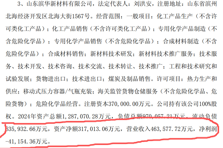 在股权融资不顺畅情况下,滨华新能源依靠负债推动项目建设,据滨化股份披露的2025年预计担保事项的公告,滨华新材料截至2024年底的资产负债率为75.38%。2024年,该公司营收为46.36亿元,净利润为-4.12亿元。截至2024年底,该公司总资产为128.71亿元,净资产为31.7亿元,其净资产已经低于37亿注册资本。