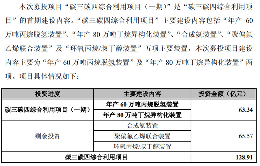 滨化股份碳三碳四项目立项于2019年。据其2019年可转债募集可行性分析报告,公司计划募集不超过24亿元,用于碳三碳四综合项目(一期),一期项目投资为63.34亿元,该项目总投资为128.91亿元。最终可转债募集23.72亿元,由全资子公司滨华新材料公司实施。