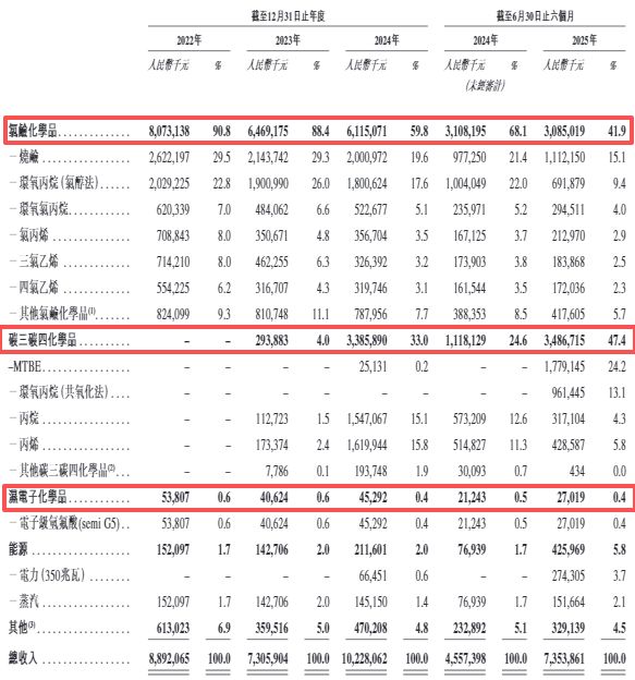 具体来看,2022年、2023年、2024年和2025年上半年(下称“报告期内”),滨化股份的主要收入来源为氯碱化学品,但占比分别为90.8%、88.4%、59.8%和41.9%——呈不断下滑趋势。同期,公司碳三碳四化学品的收入占比从0上升至47.4%。