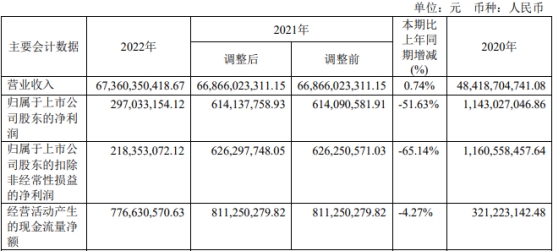友发集团(601686.SH)昨日晚间发布2022年年度报告。2022年,公司实现营业收入673.60亿元,同比增长0.74%;实现归属于上市公司股东的净利润2.97亿元,同比下降51.63%;实现归属于上市公司股东的扣除非经常性损益的净利润2.18亿元,同比减少65.14%;经营活动产生的现金流量净额为7.77亿元,同比减少4.27%。