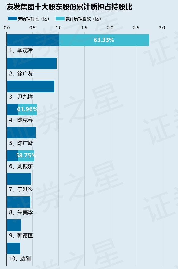 截止本公告日,股东李茂津已累计质押股份1.74亿股,占其持股总数的63.33%,股东陈克春已累计质押股份3635.47万股,占其持股总数的61.96%,股东刘振东已累计质押股份3127.02万股,占其持股总数的58.75%。本次质押后友发集团十大股东的累计质押股份占持股比例见下图: