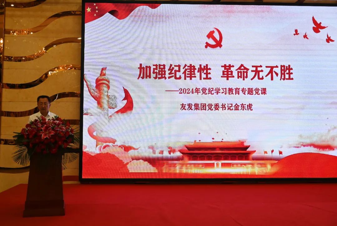 会上,金东虎以《加强纪律性,革命无不胜》为题作专题党课分享,从党的纪律性加强工作出发,结合实际对友发日常管理工作的制度化、流程化、标准化进行了延伸并提出要求。