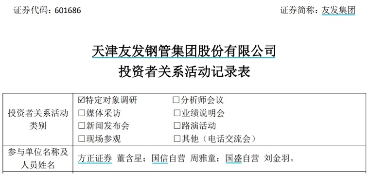 近日,上市公司友发集团(601686)发布了《投资者关系活动记录表》,披露公司接待了方正证券、国信证券、国盛证券等机构的现场调研,公司董事会秘书、投关专员等人士参与并解机构代表提问。