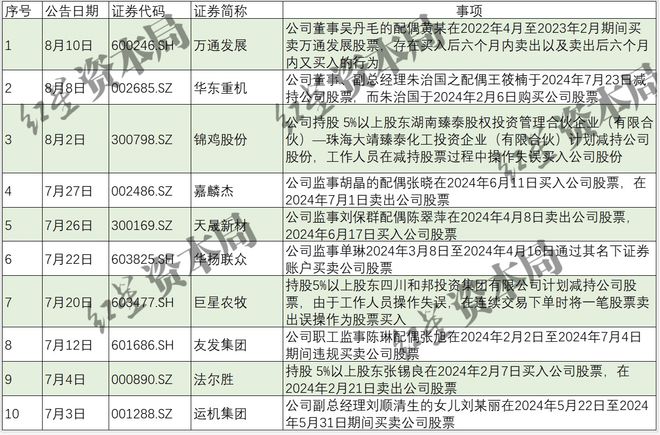 据红星资本局不完全统计,今年下半年,7月1日-8月14日,A股共有10家公司发布了短线交易及致歉相关公告。
