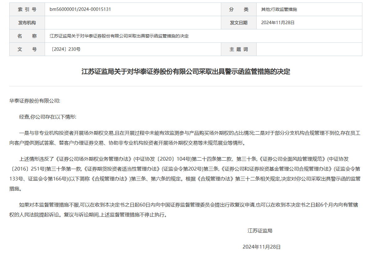 江苏证监局决定对华泰证券采取出具警示函的监管措施。