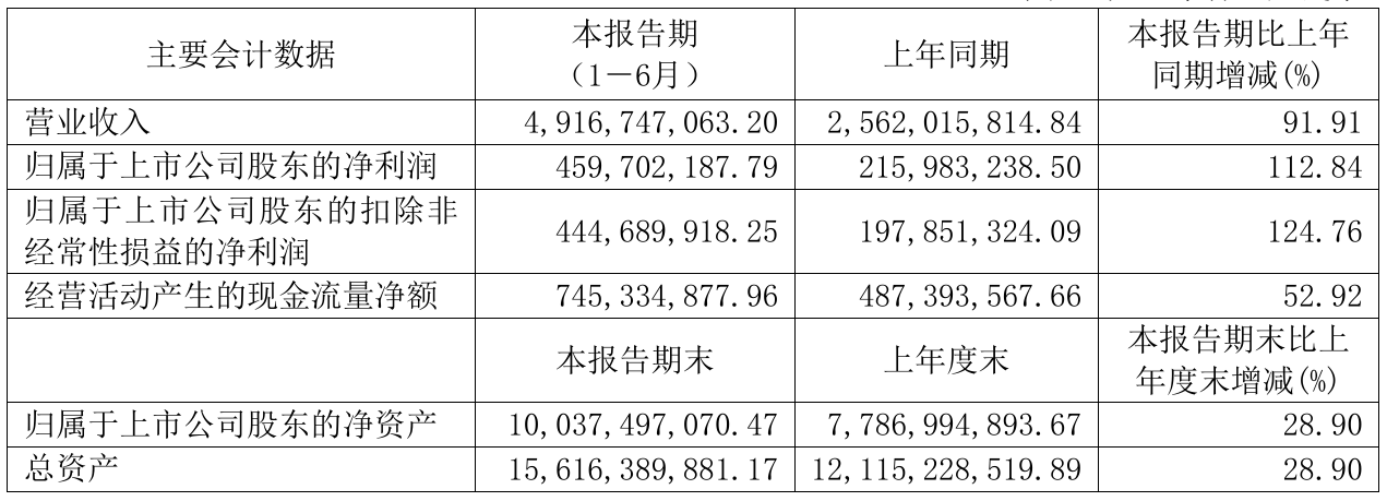 挖贝网8月19日,拓普集团(601689)近日发布2021年半年度报告,报告期内营业收入4,916,747,063.20元,同比增加91.91%;净利459,702,187.79元,同比净利增加112.84%。