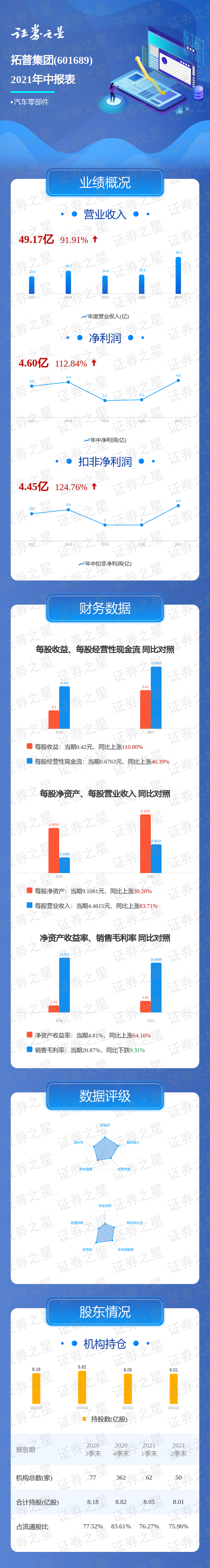 证券之星数据中心讯,拓普集团2021中报显示,公司主营收入49.17亿元,同比上升91.91%;归母净利润4.6亿元,同比上升112.84%;扣非净利润4.45亿元,同比上升124.76%;负债率35.5%,投资收益1276.61万元,财务费用-87.52万元,毛利率20.87%。
