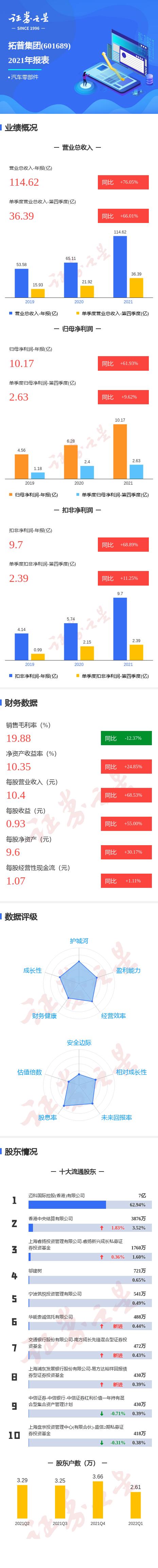 拓普集团2022一季报显示,公司主营收入37.45亿元,同比上升54.34%;归母净利润3.86亿元,同比上升56.84%;扣非净利润3.77亿元,同比上升57.08%;其中2022年第一季度,公司单季度主营收入37.45亿元,同比上升54.34%;单季度归母净利润3.86亿元,同比上升56.84%;单季度扣非净利润3.77亿元,同比上升57.08%;负债率45.5%,投资收益695.6万元,财务费用224.29万元,毛利率20.77%。