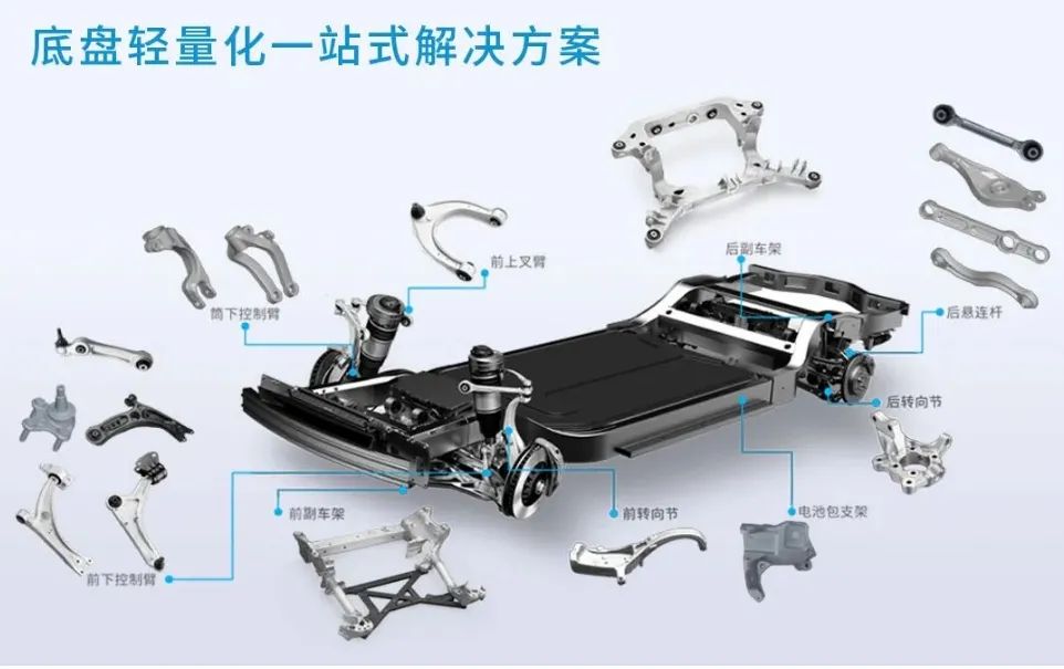 近年来,随着新能源汽车轻量化产业的蓬勃发展,对轻量化底盘需求的大幅增长。拓普集团积极布局汽车轻量化赛道,现已具备轻量化底盘系统级的设计、验证及生产能力,该系统包括前/后副车架、控制臂、拉杆、转向节等产品。拓普已构建中国乃至世界最完整的轻量化工艺布局,覆盖铝合金锻造、差压铸造、挤压铸造、高压压铸、真空铸造、砂型铸造等多种工艺。