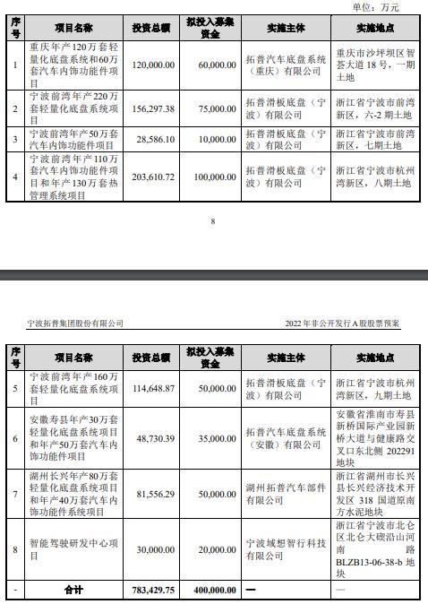 本次发行募集资金总额不超过40.00亿元,扣除发行费用后将用于重庆年产120万套轻量化底盘系统和60万套汽车内饰功能件项目、宁波前湾年产220万套轻量化底盘系统项目、宁波前湾年产50万套汽车内饰功能件项目、宁波前湾年产110万套汽车内饰功能件项目和年产130万套热管理系统项目、宁波前湾年产160万套轻量化底盘系统项目、安徽寿县年产30万套轻量化底盘系统项目和年产50万套汽车内饰功能件项目、湖州长兴年产80万套轻量化底盘系统项目和年产40万套汽车内饰功能件系统项目、智能驾驶研发中心项目。