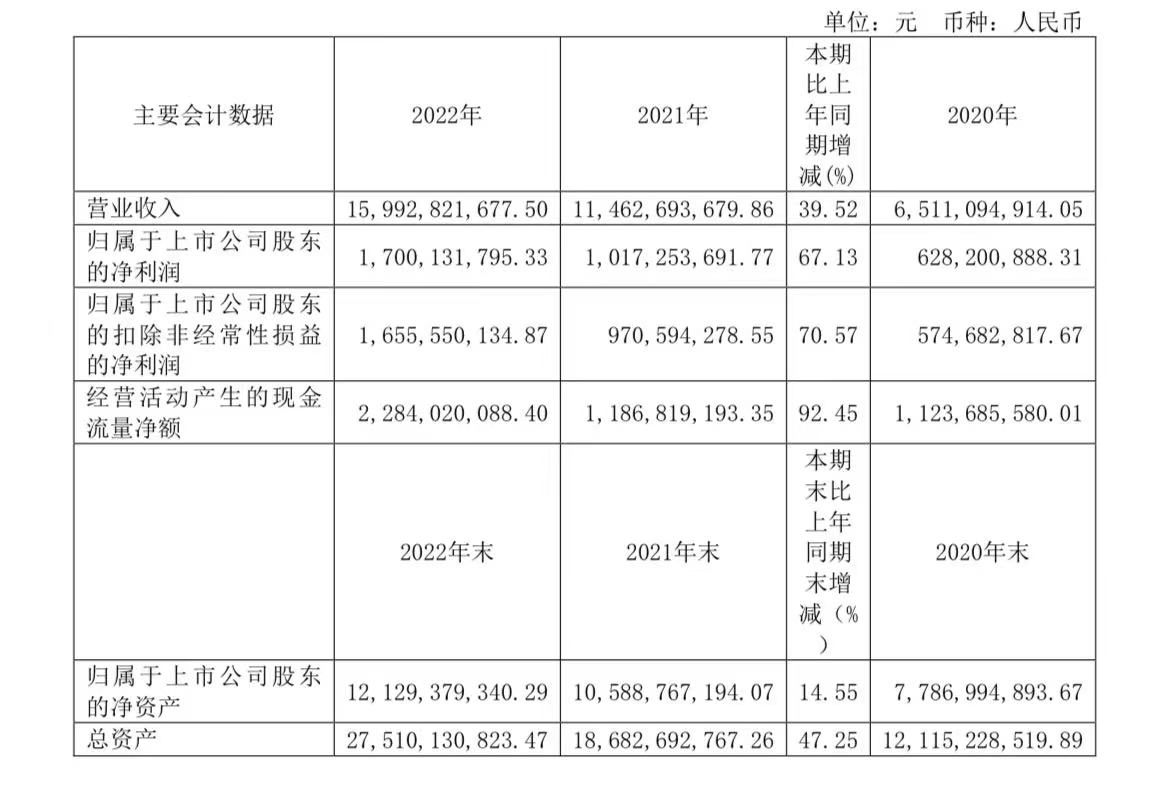 根据公告,公司实现营业收入159.93亿元同比增长39.52%;归属于上市公司股东的净利润17亿元,同比增长67.13%。