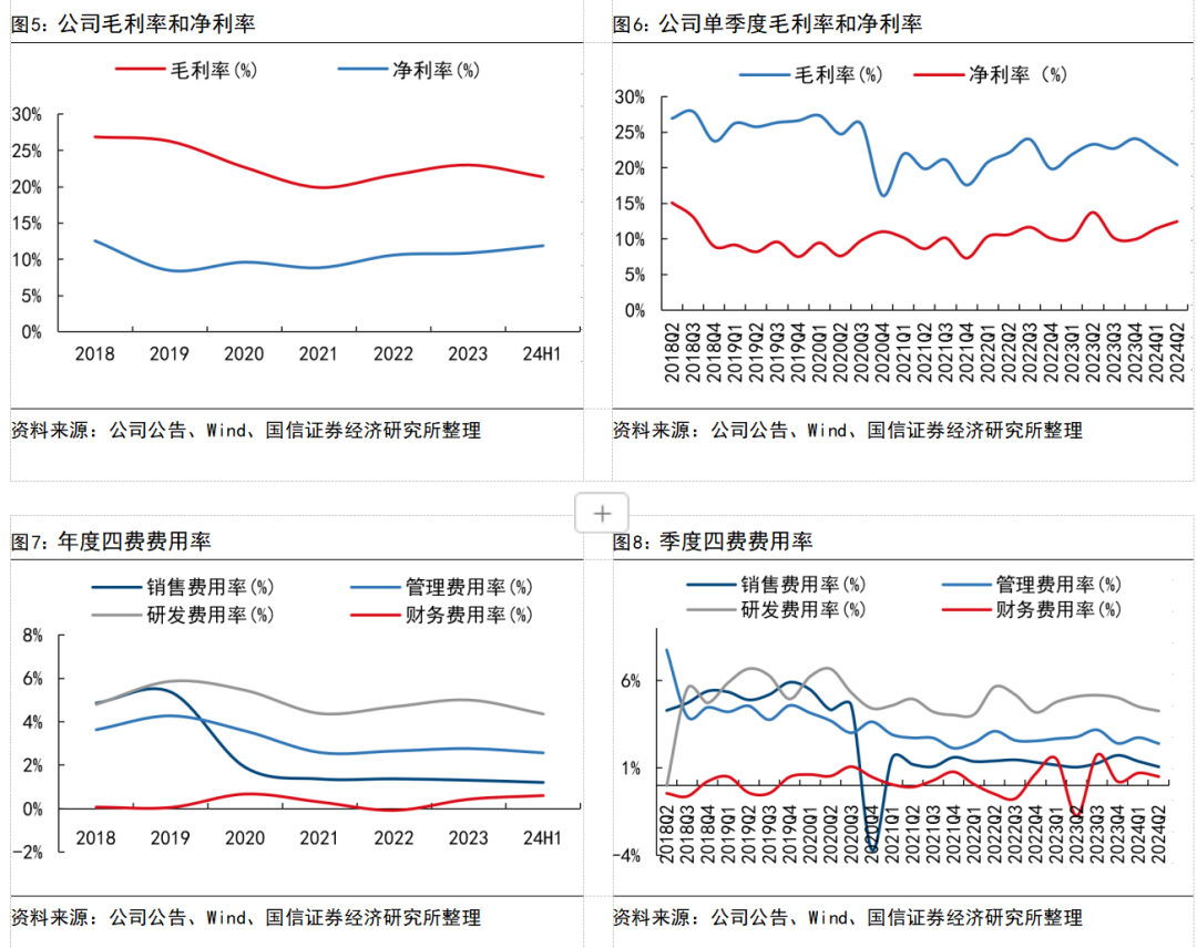 业绩概述:拓普集团24H1营收122.3亿元,同比+33%;单季度来看,营收65.4亿,环比+15%,同比+39%,营收环比+8.5亿元,预计主要系问界、小米、理想、比亚迪以及极氪等客户贡献;24H1拓普实现归母净利润14.5亿元,同比+33%;单季度来看,归母净利润8.1亿元,同比+25%,环比+25%,扣非净利润7.0亿元,同比+15%,环比+17%,考虑到23Q2汇兑影响,预计利润实际同比增速更为可观;整体来看,得益于公司多产品线的稳定放量(汽车电子+原有主业)以及降本增效的持续推进,经营业绩保持持续增长态势。