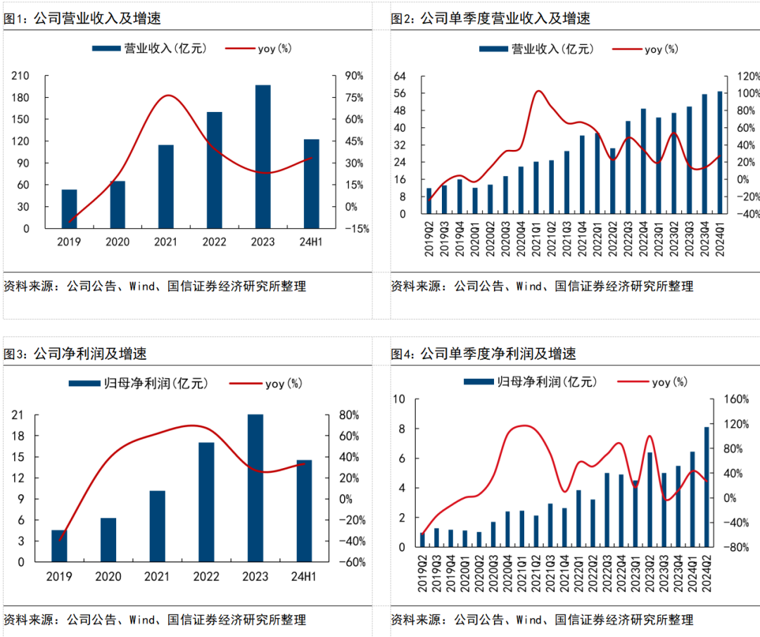 拓普集团24H1营收122.3亿元,同比+33%;单季度来看,营收65.4亿,同比+39%,环比+15%,营收环比+8.5亿元,预计主要系问界、小米、理想、比亚迪及吉利等客户贡献;24H1拓普实现归母净利润14.5亿元,同比+33%;单季度来看,归母净利润8.1亿元,同比+26%,环比+26%,扣非净利润7.0亿元,同比+15%,环比+17%,考虑到23Q2汇兑影响,预计利润实际同比增速更为可观;整体来看,得益于公司多产品线的稳定放量(汽车电子+原有主业)以及降本增效的持续推进,经营业绩保持持续增长态势。