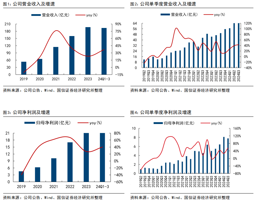 2024年前三季度,拓普实现营收193.5亿元,同比36.8%,归母净利润22.3亿元,同比+39.9%,扣非净利润20.2亿元,同比+34.8%;单季度看,24Q3拓普营收71.3亿元,同比+42.9%,环比+9.1%;归母净利润7.8亿元,同比+54.6%,环比-4.1%;扣非净利润7.3亿元,同比+53.7%,环比+4.0%。整体来看,得益于公司多产品线的稳定放量(汽车电子+原有主业)以及降本增效的持续推进,经营业绩保持持续增长态势。