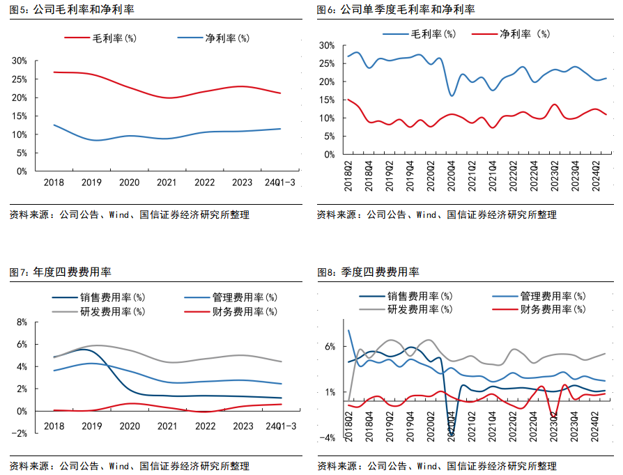 24Q3拓普销售/管理/研发/财务费用率分别为1.1%/2.2%/5.2%/0.8%,同比-0.1/-1.0/-0.6/-1.5pct,环比+0.1/-0.2/+0.4/+0.2pct,整体看费用管控稳定;24Q3毛利率20.9%,同比-1.8pct,环比+0.5pct,归母净利率10.9%,同比+0.8pct,环比-1.5pct;扣非净利率10.2%,同比+0.7pct,环比-0.5pct(Q1政府补助0.58亿元,Q2为1.1亿元,Q3为0.4亿元),1-9月公司折旧摊销12.3亿元(营收占比6.36%),Q3为4.3亿元(营收占比6.07%),公司规模效应持续兑现;前三季度公司减震器营收33.2亿元,同比+14.9%;内饰营收60.2亿元,同比+25.8%;底盘营收60.1亿元,同比+33.1;热管理营收15.0亿元,同比+28.4%;汽车电子业务实现营收12.9亿元,同比+940.3%,平台型优势持续体现。
