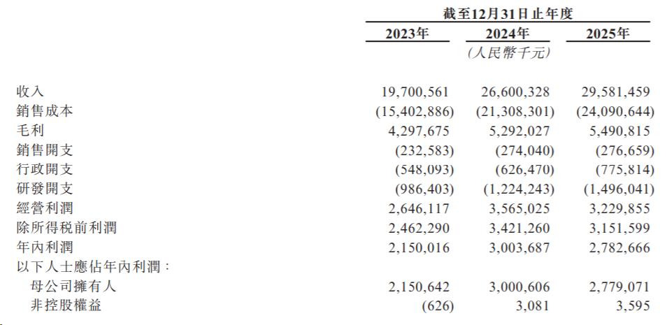 于2023年度、2024年度、2025年度,公司实现收入分别约197亿元、266亿元、295.81亿元;年内利润分别约21.50亿元、30.04亿元、27.83亿元。