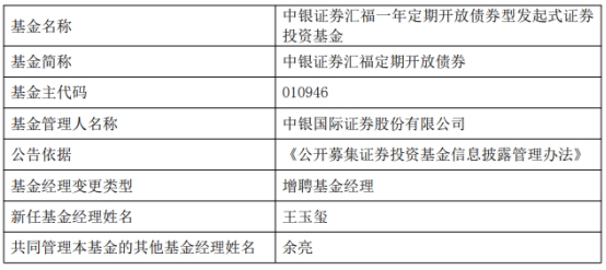 其中,中银证券汇享定期开放债券由原共同管理该基金的王文华独立管理;中银证券盈瑞混合增聘基金经理王文华,与蒲延杰共同管理;中银证券安泰债券增聘基金经理王文华,与刘先政共同管理;中银证券汇福定期开放债券增聘基金经理王玉玺,与余亮共同管理。