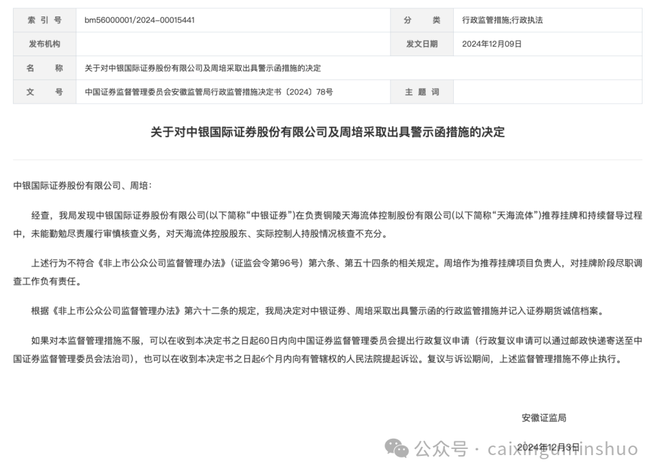 监管部门的重拳出击:中银证券与项目人负责遭处罚
