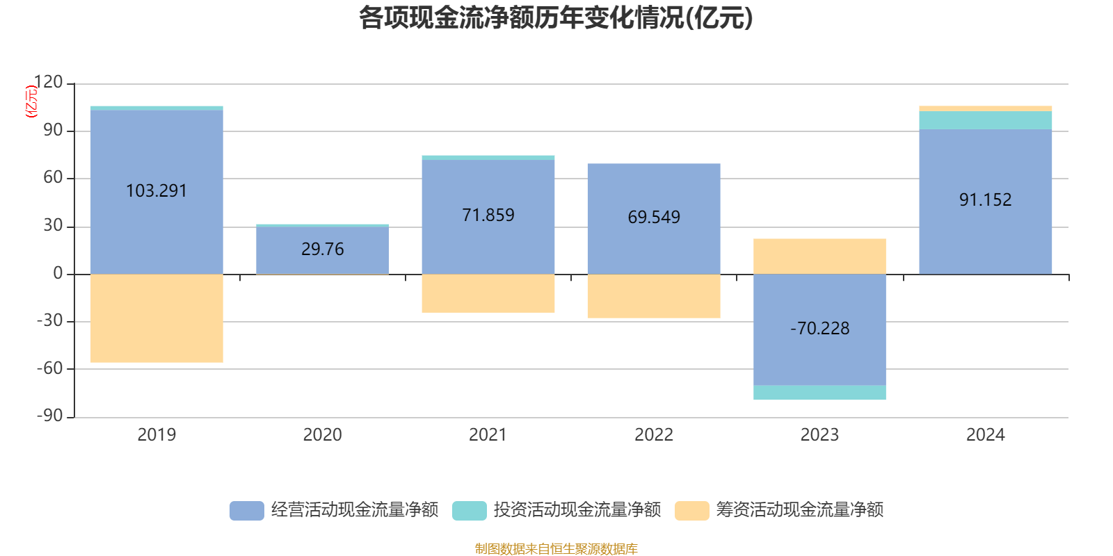截至2024年,公司经营活动现金流净额为91.15亿元,同比增加161.38亿元;筹资活动现金流净额3.27亿元,同比减少18.95亿元;投资活动现金流净额11.42亿元,上年同期为-8.87亿元。