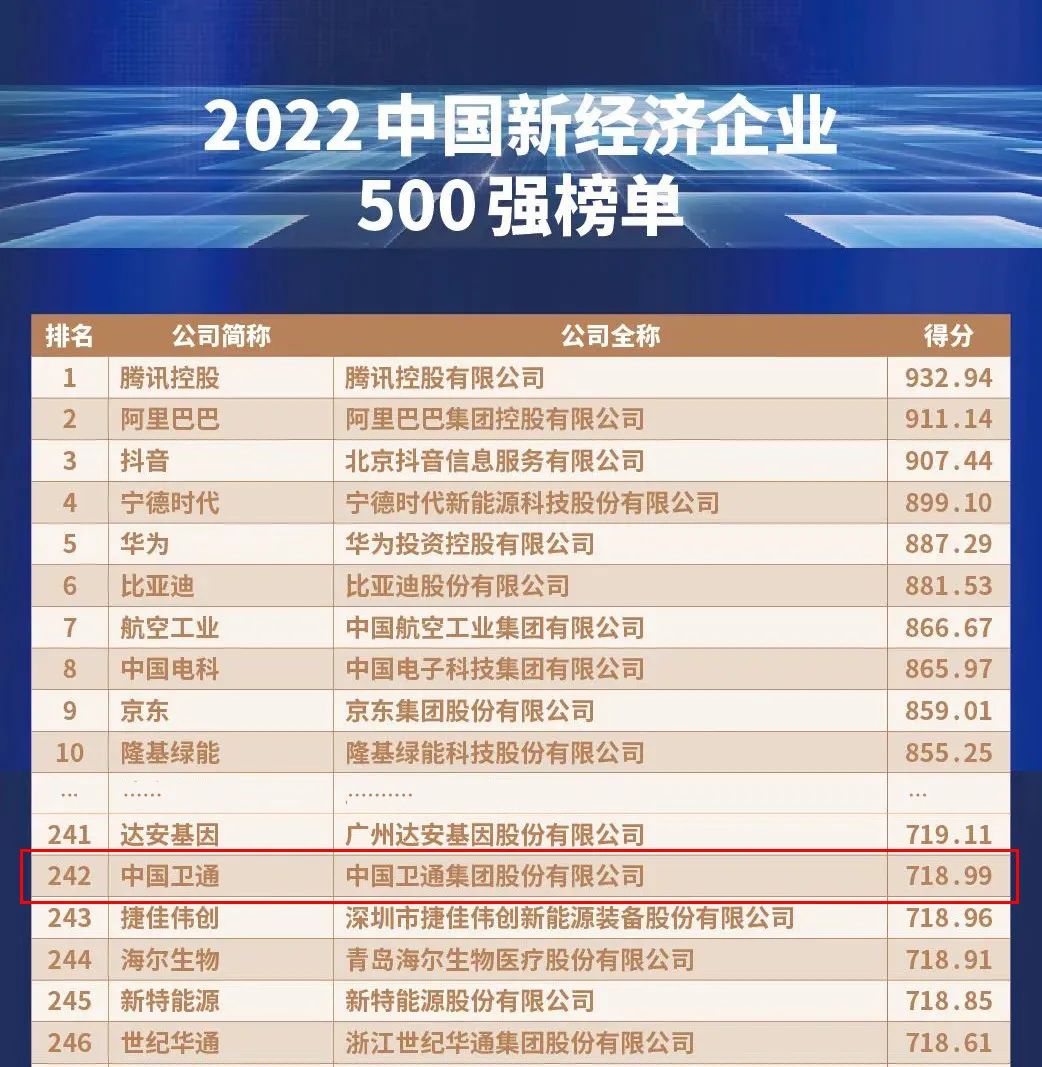 3月30日,2022中国新经济企业500强榜单重磅发布。凭借在卫星通信行业的深厚积累和积极探索,中国卫通成功入选该榜单,位列242位。