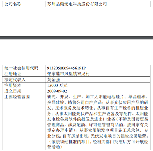 据了解,晶樱光电主要经营范围包括研究、开发、生产、加工太阳能电池硅片、单晶硅棒、多晶硅锭,销售公司自产产品;从事光伏应用产品的研发、技术服务及技术转让等。